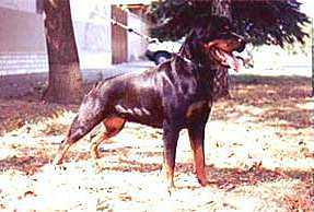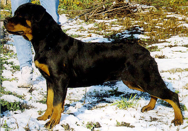 21.05.2000 Medium Size (60 cm), Medium constitution. Typey head, Strong Complete Scissors Bite, Good pigment, Eye 2A. Eyelids close fitting. Strong ,well muscled neck free of dewlap. Strong back, in movement stable. Good angulation of front and rear extremities. Harmonious, lively energetic movement. |
