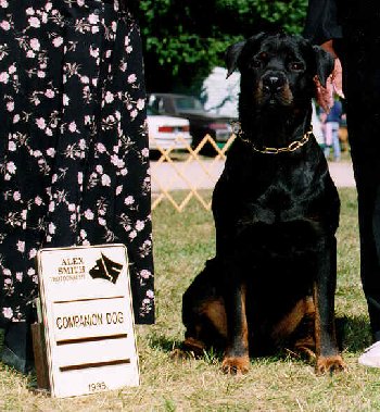CGC 1993-1996 "Braxx" was my introduction with male Rottweilers and he was an absolute dream to train and own. Braxx was so well behaved and did everything I asked of him. Braxx was OFA Good, OFA Elbows, CERF. |