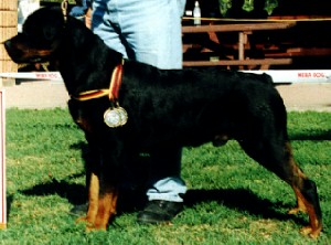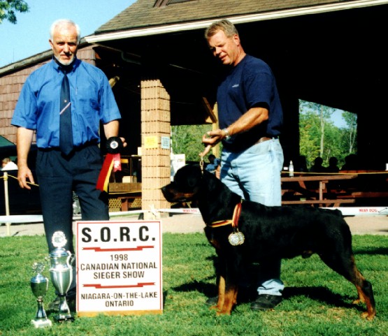 Not only did he show well...but he also won his 9-12 months old class and but we also brought home the 1997 Canadian National Most Promising Puppy Dog trophy under ADRK Judge, Werner Walter (vom Kressbach) |