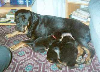 2 Girls, 1 Boy Wow! What a quick and easy birth. This was KD's first litter, but coupled with athleticism, muscular body, and powerful muscles, you would not believe how easy these pups were born. KD has been swimming almost daily, up to last Thursday, and went for a hike through a wonderful trail on Saturday, the day before the birth! With these puppies, I am hoping to shorten KD's length of back, with Donnie's help....Donnie offers a short, tight back, with incredible head, body and temperament, dark pigment, angles, and bone. KD will hopefully offer her incredible bone, *excellent* temperament, dark pigment, movement, typey head, more front and rear angulation to her puppies, as well as larger size.. Coupled with Donnie's short, straight topline, angles, temperament, type, this litter should be outstanding! This is a linebreeding