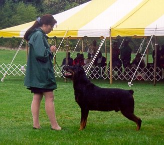 1988-1999 Aiko was a wonderful, correct Rottweiler. He was simply full of confidence and humour. He slept beside my bed for his veteran years. When I picture excellent movement, I think of Aiko. You couldn't feel any pressure on the leash while showing him. He floated. |